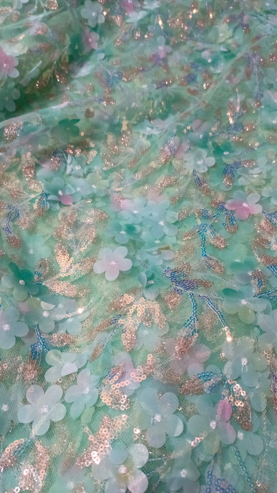The refreshing turquoise shade combined with detailed vine-style sequin patterns creates a graceful and eye-catching look, making it perfect for weddings, parties, Eid, formal events, and special occasions. The semi-sheer net texture adds a soft and luxurious fall once stitched.