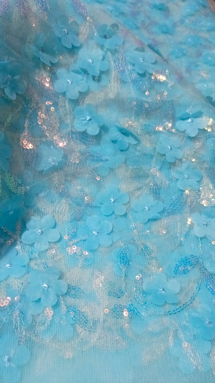 The refreshing turquoise shade combined with detailed vine-style sequin patterns creates a graceful and eye-catching look, making it perfect for weddings, parties, Eid, formal events, and special occasions. The semi-sheer net texture adds a soft and luxurious fall once stitched.