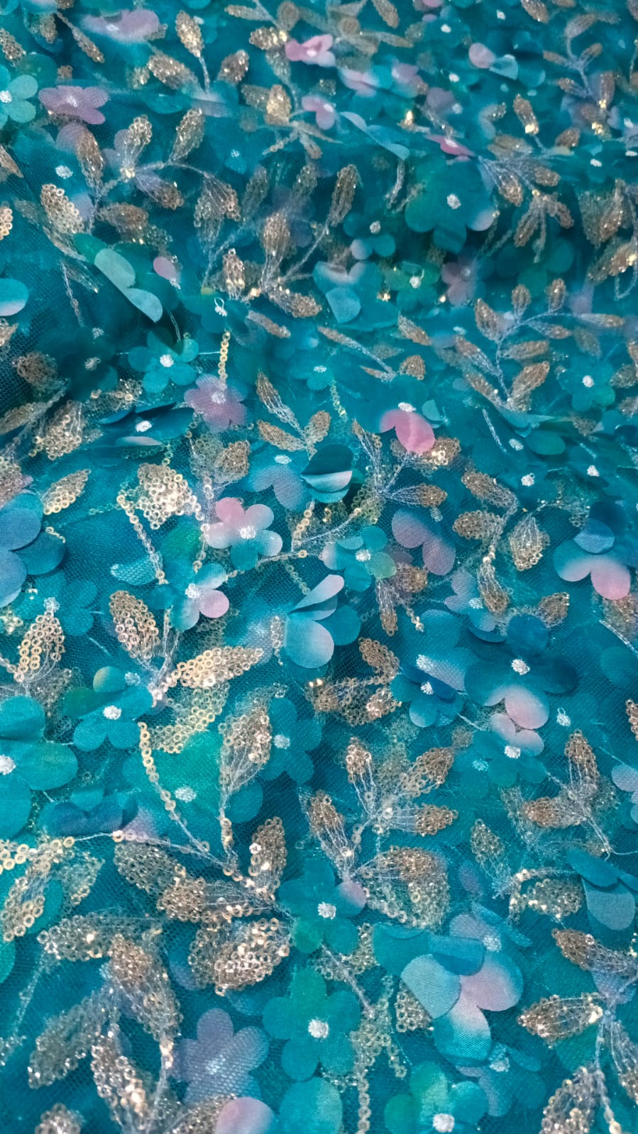 The refreshing turquoise shade combined with detailed vine-style sequin patterns creates a graceful and eye-catching look, making it perfect for weddings, parties, Eid, formal events, and special occasions. The semi-sheer net texture adds a soft and luxurious fall once stitched.
